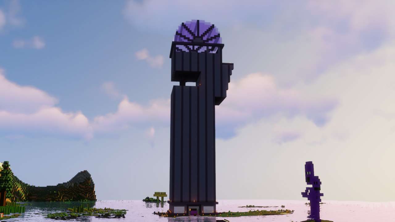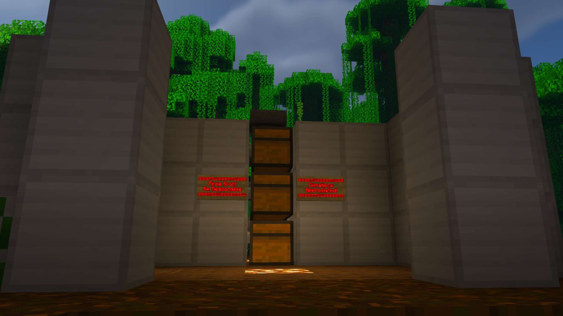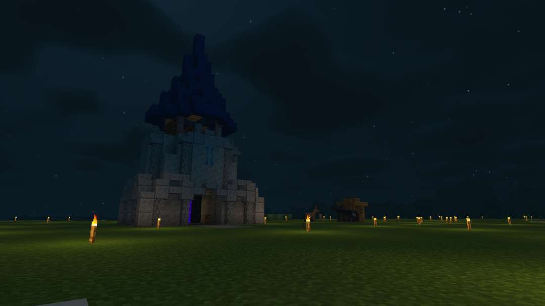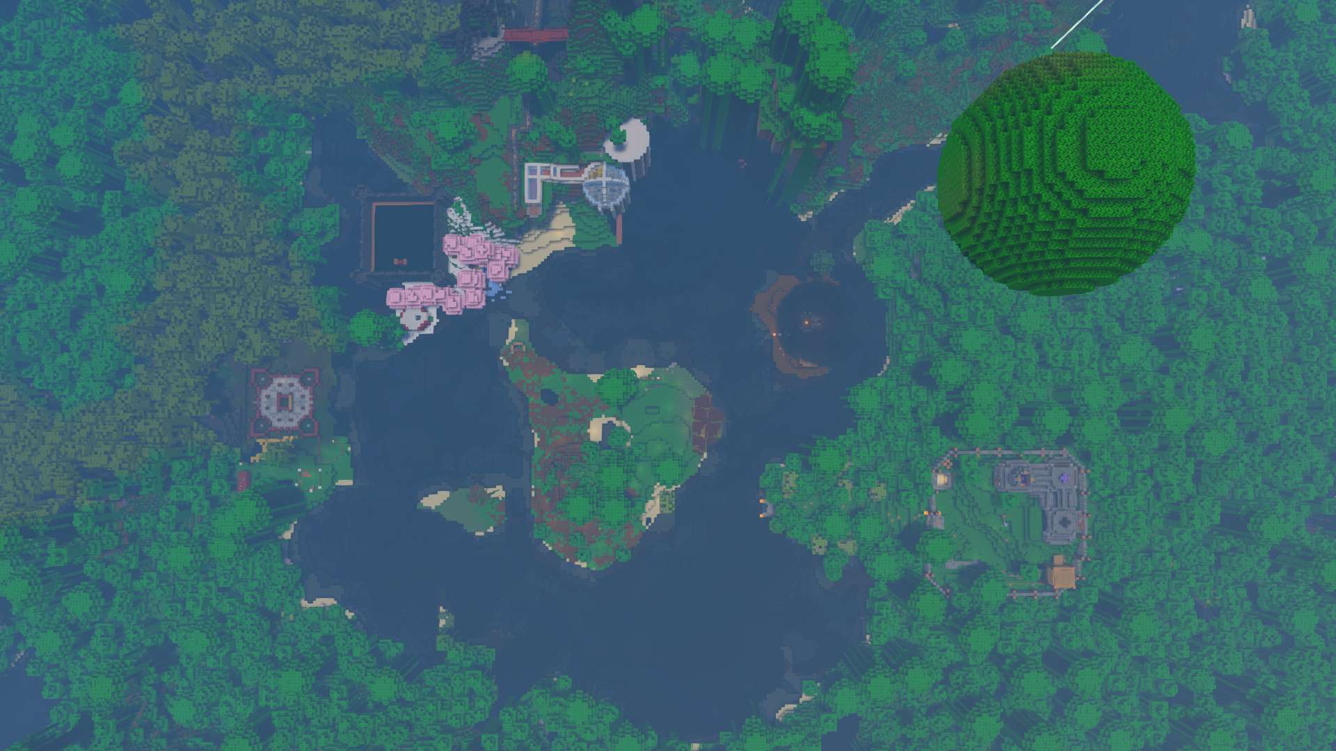 centered in a jungle, this world contains many builds of disperate art styles. A castle, some ruins, some blue domes, and a Mitre 10 Mega department store. I also built a giant floating orb of leaves to house an iron farm.