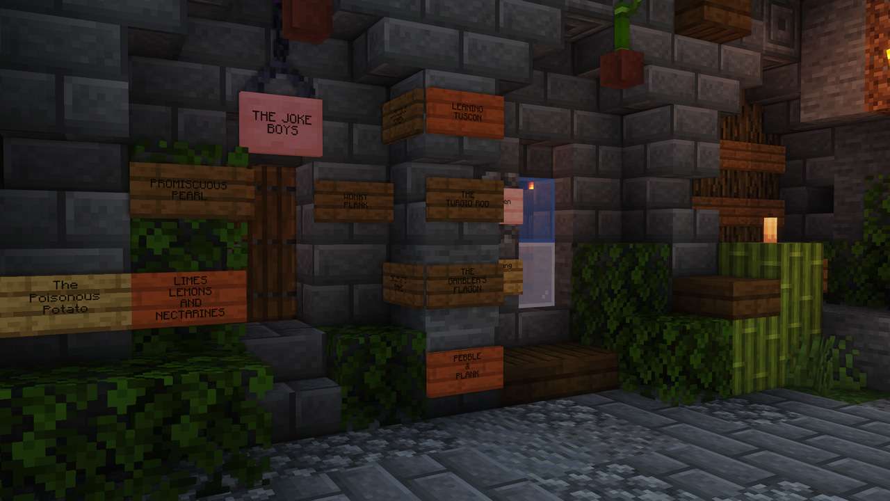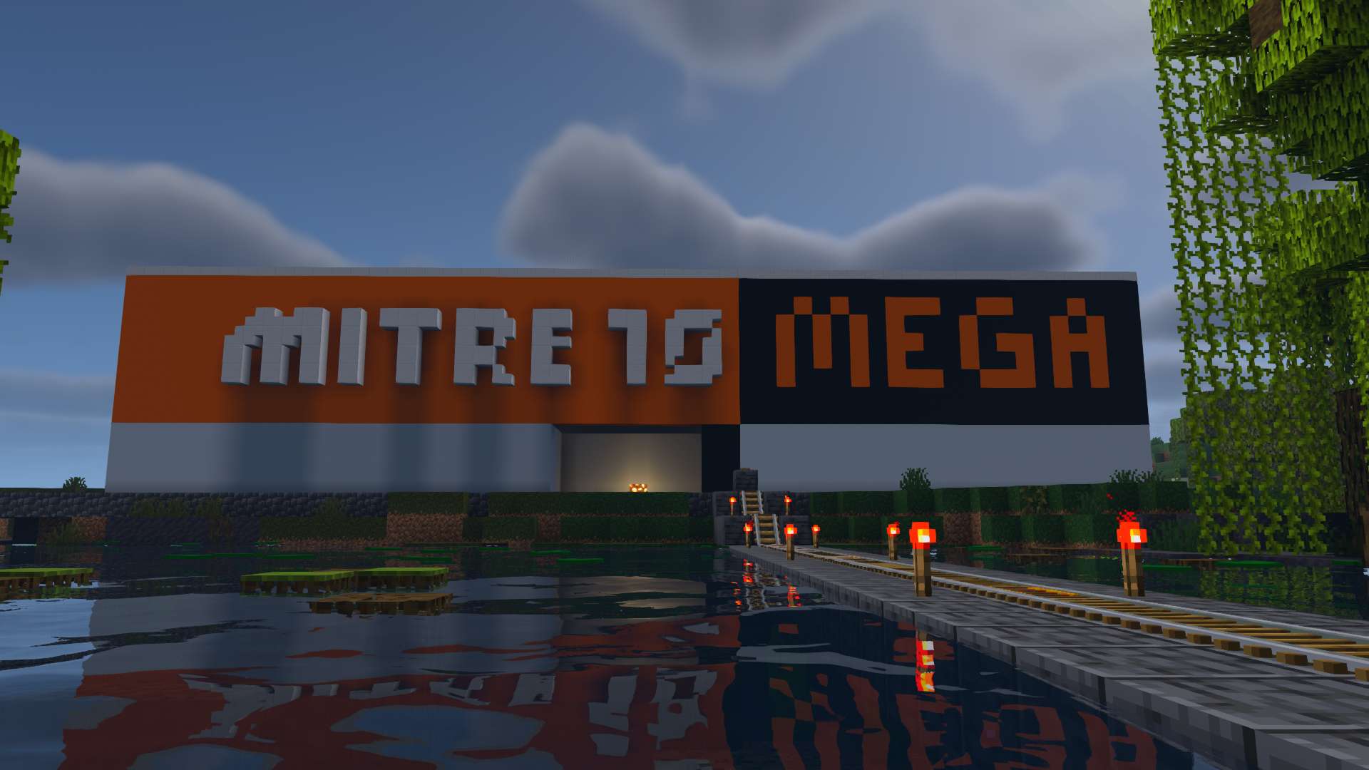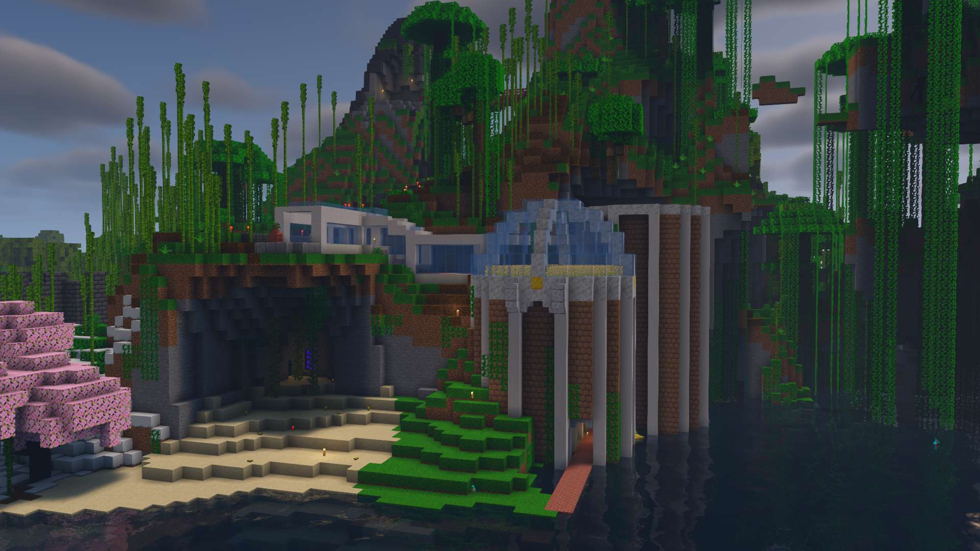centered in a jungle, this world contains many builds of disperate art styles. A castle, some ruins, some blue domes, and a Mitre 10 Mega department store. I also built a giant floating orb of leaves to house an iron farm.