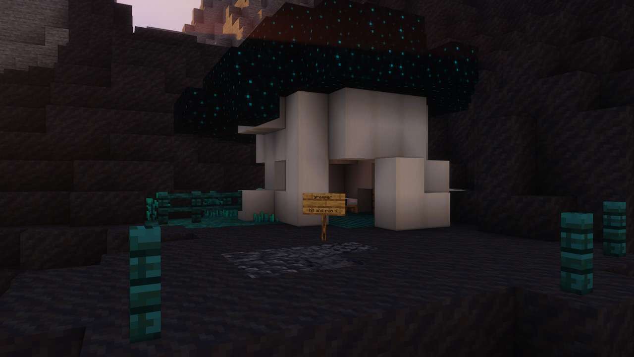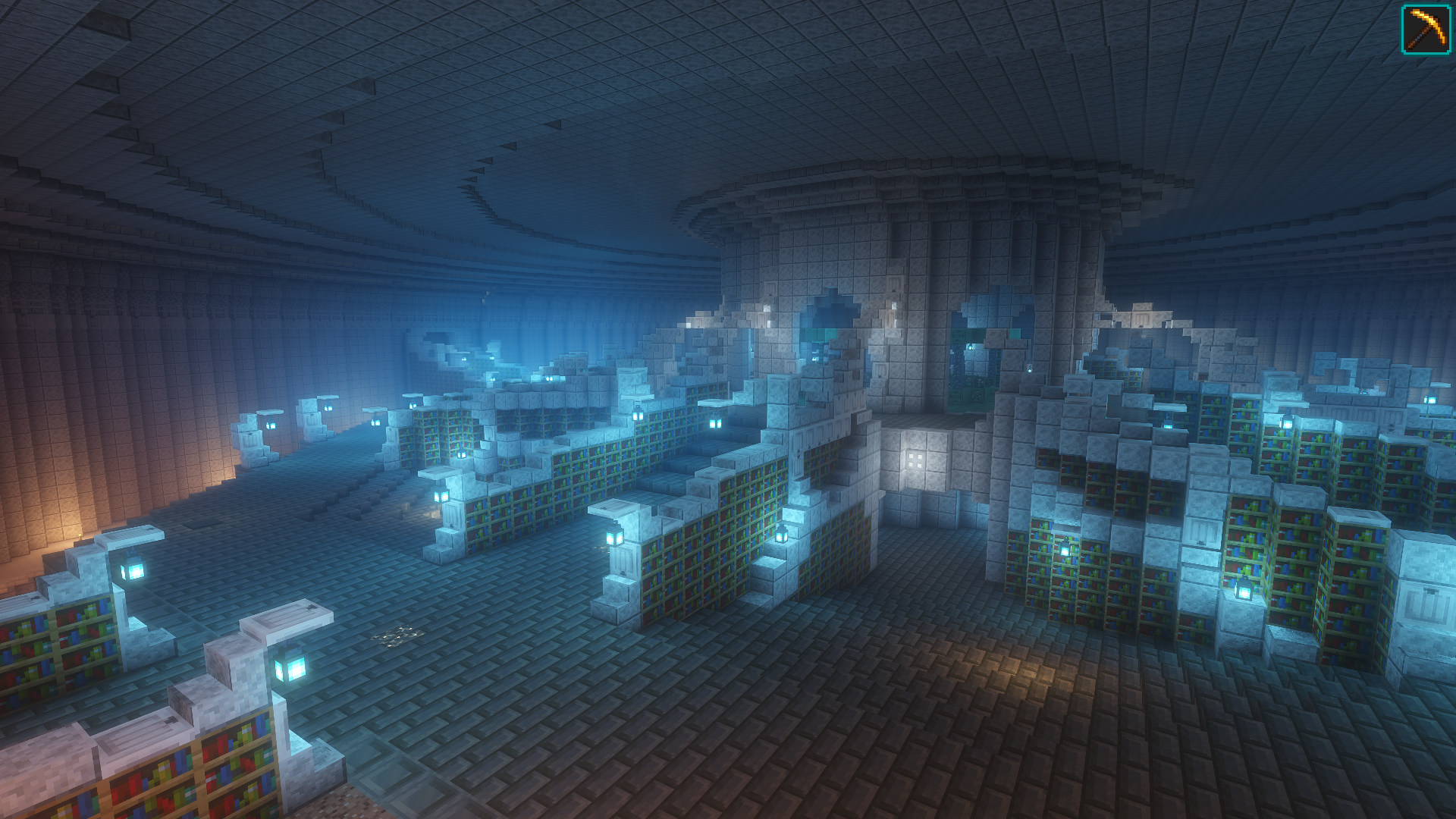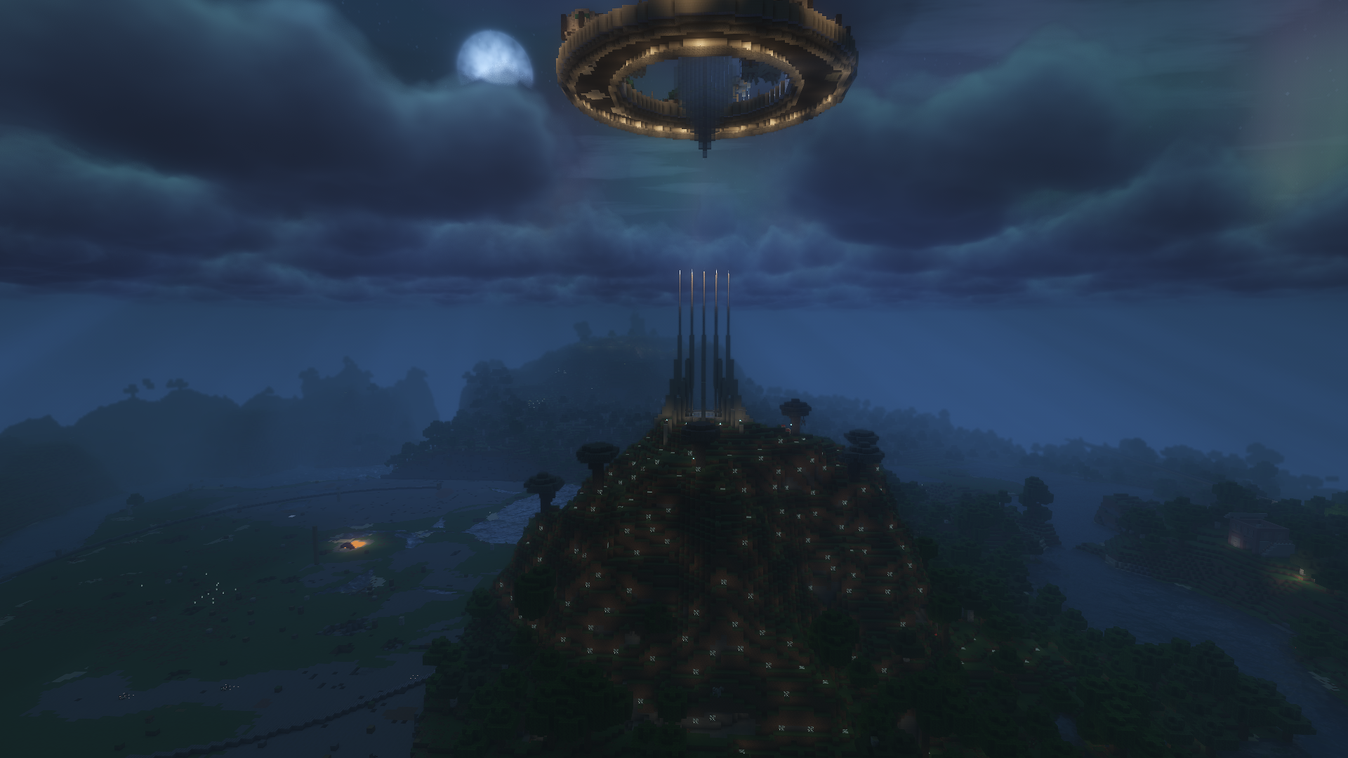 Apologies, not all images here will have alt text. I'll write a general description of each world and it's builds in the alt for the first image. This world contains many cozy builds in cliff faces and walls, a sterile white blue and orange base from me, and a giant floating ring with crystal marking the entrance to a massive underground library.