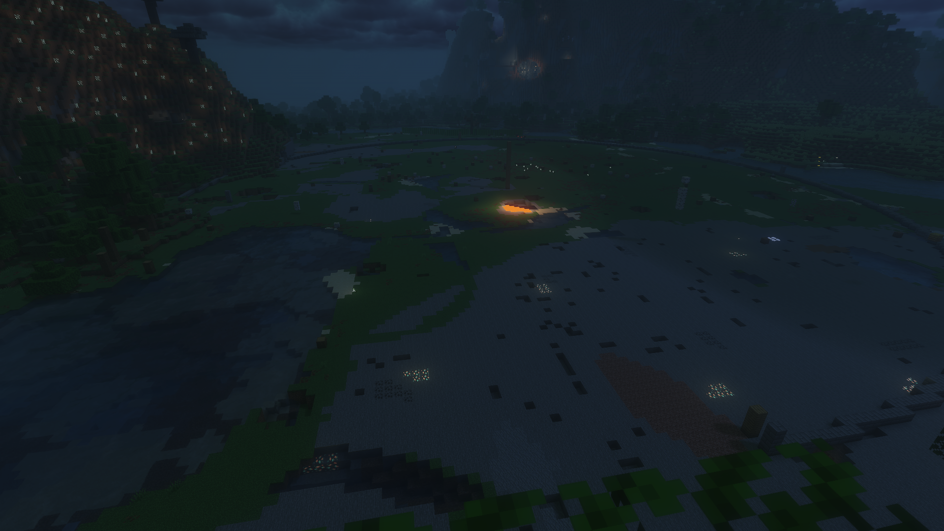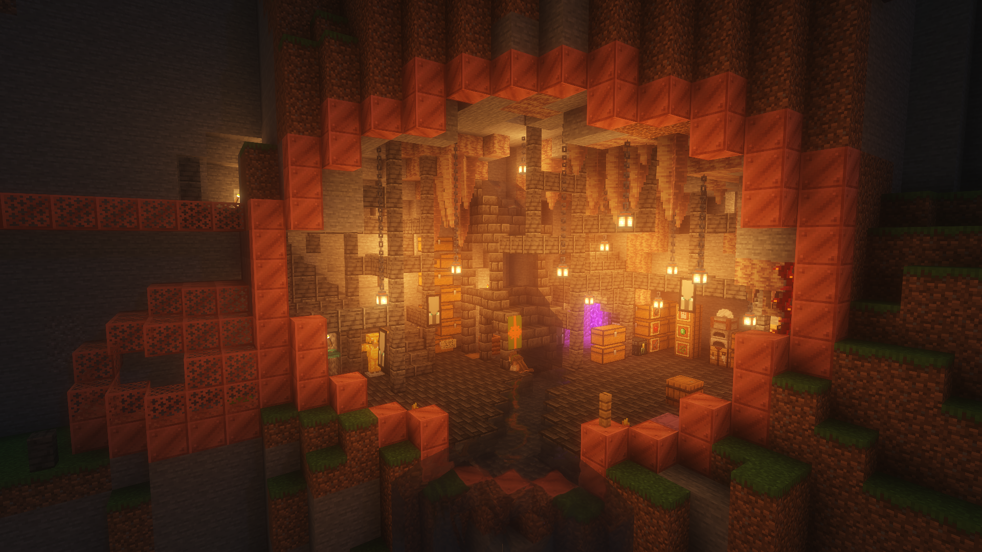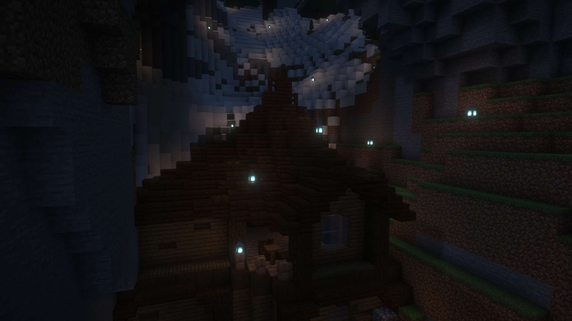 Apologies, not all images here will have alt text. I'll write a general description of each world and it's builds in the alt for the first image. This world contains many cozy builds in cliff faces and walls, a sterile white blue and orange base from me, and a giant floating ring with crystal marking the entrance to a massive underground library.